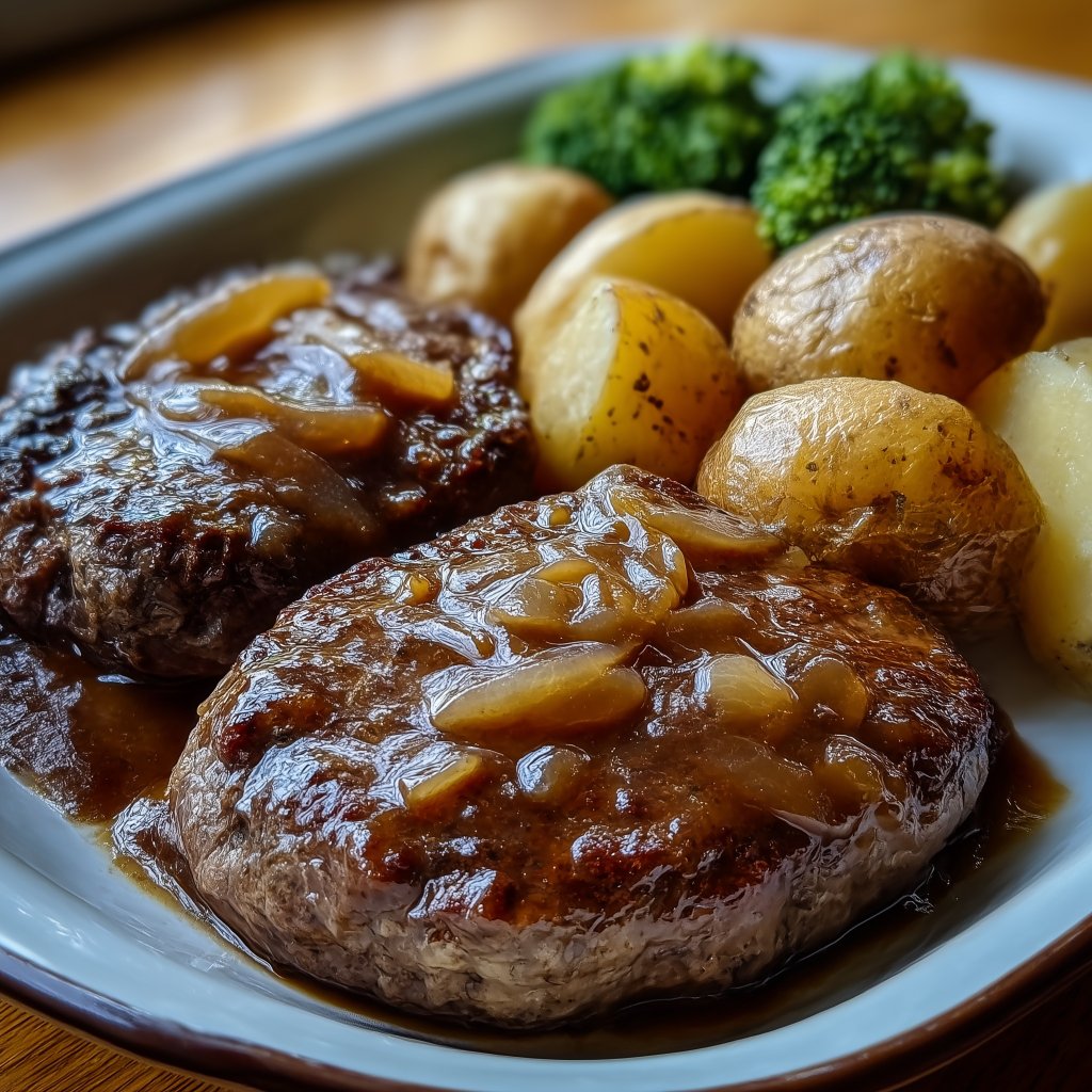 They’re close cousins. Both use seasoned ground beef shaped into patties and served with gravy. Poor Man’s Steak often gets dredged in flour, browned, then baked in gravy, which gives it that “smothered” texture all the way through.
