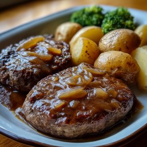 - Pour gravy over patties. Cover with foil and bake 30 minutes. Uncover and bake 15–20 minutes until patties are cooked through and gravy thickened.