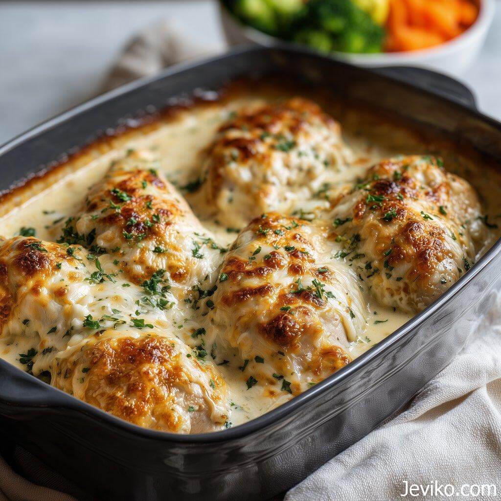 What I love about this recipe is how it turns very ordinary ingredients into something that feels comforting and complete. The chicken comes out tender, the sauce becomes silky from the cream, and the melted cheese creates this gentle richness that wraps around everything. It’s the kind of meal that doesn’t try too hard, yet somehow feels special once you sit down with it.