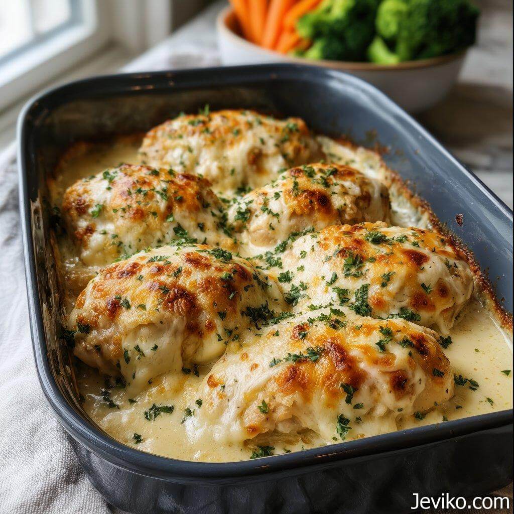 What I love about this recipe is how it turns very ordinary ingredients into something that feels comforting and complete. The chicken comes out tender, the sauce becomes silky from the cream, and the melted cheese creates this gentle richness that wraps around everything. It’s the kind of meal that doesn’t try too hard, yet somehow feels special once you sit down with it.