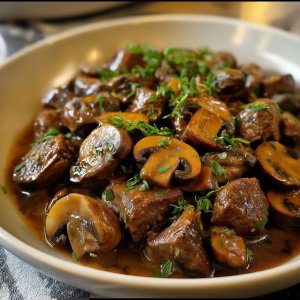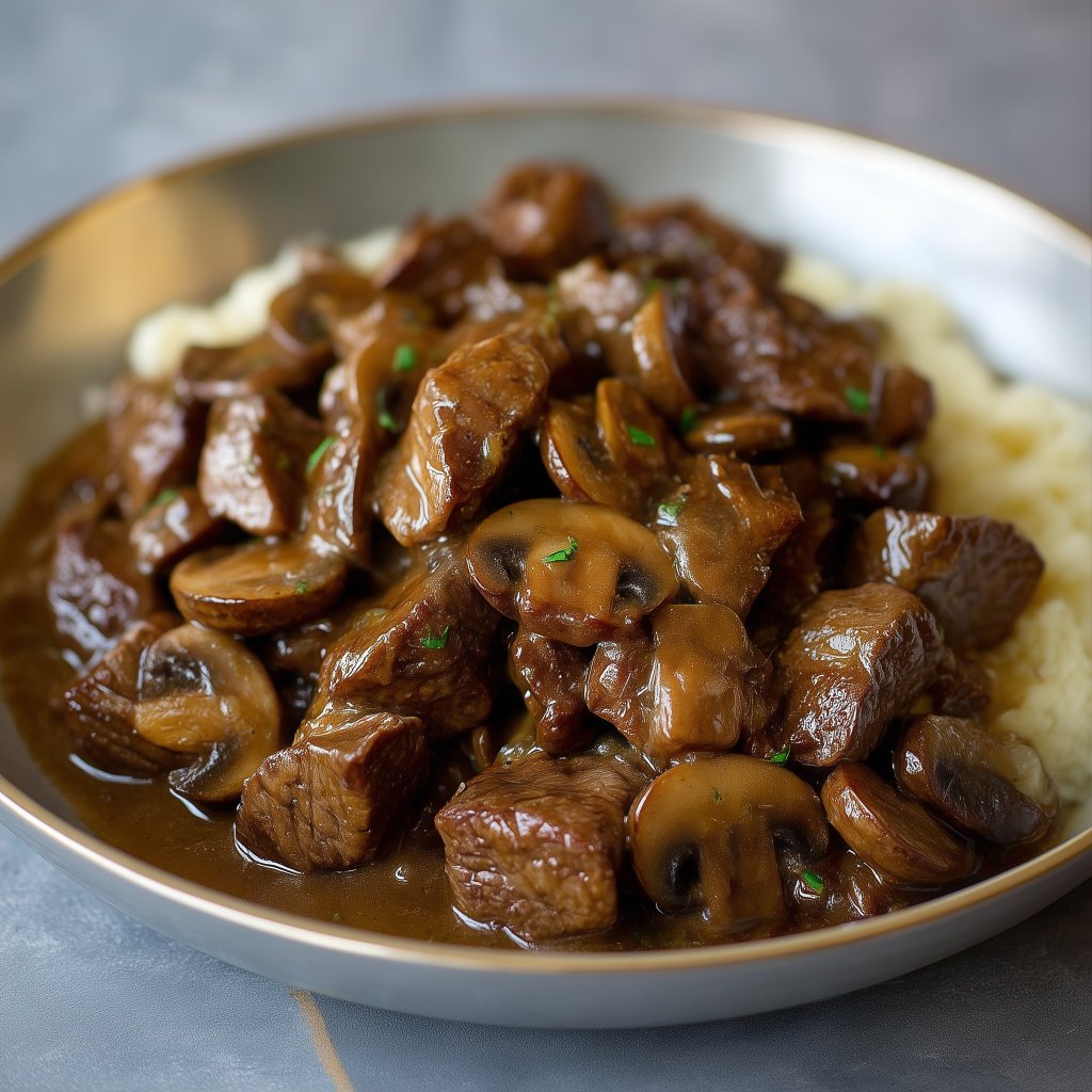 Real comfort food. The gravy is rich, savory, and coats every bite of beef and mushroom.