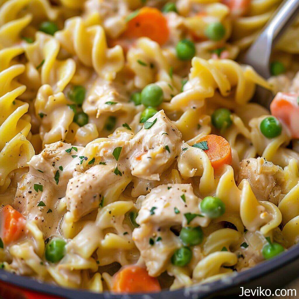 Hello my food-loving friends! It’s Jeviko here, bubbling over with excitement to share my simple yet scrumptious creamy chicken pot pie pasta recipe. This cozy, hearty dish has become a regular on our dinner table because it comes together in a jiffy, uses pantry staples I keep on hand, and satisfies our cravings for classic chicken pot pie flavors without the fuss. I reimagined the best parts – juicy chicken, carrots, peas and a luscious homemade cream sauce – then tossed them with pasta for the ultimate comfort food mashup. Each comforting bite feels like a big, warm hug. My partner and kids can’t get enough of this recipe. I know it will quickly become a favorite for your family too!