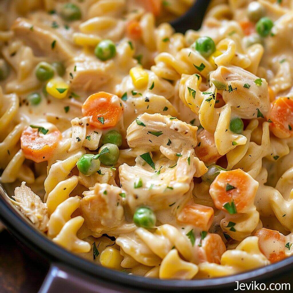 - Serve warm right away so the noodles don’t overcook. Enjoy this one-pot creamy comfort!