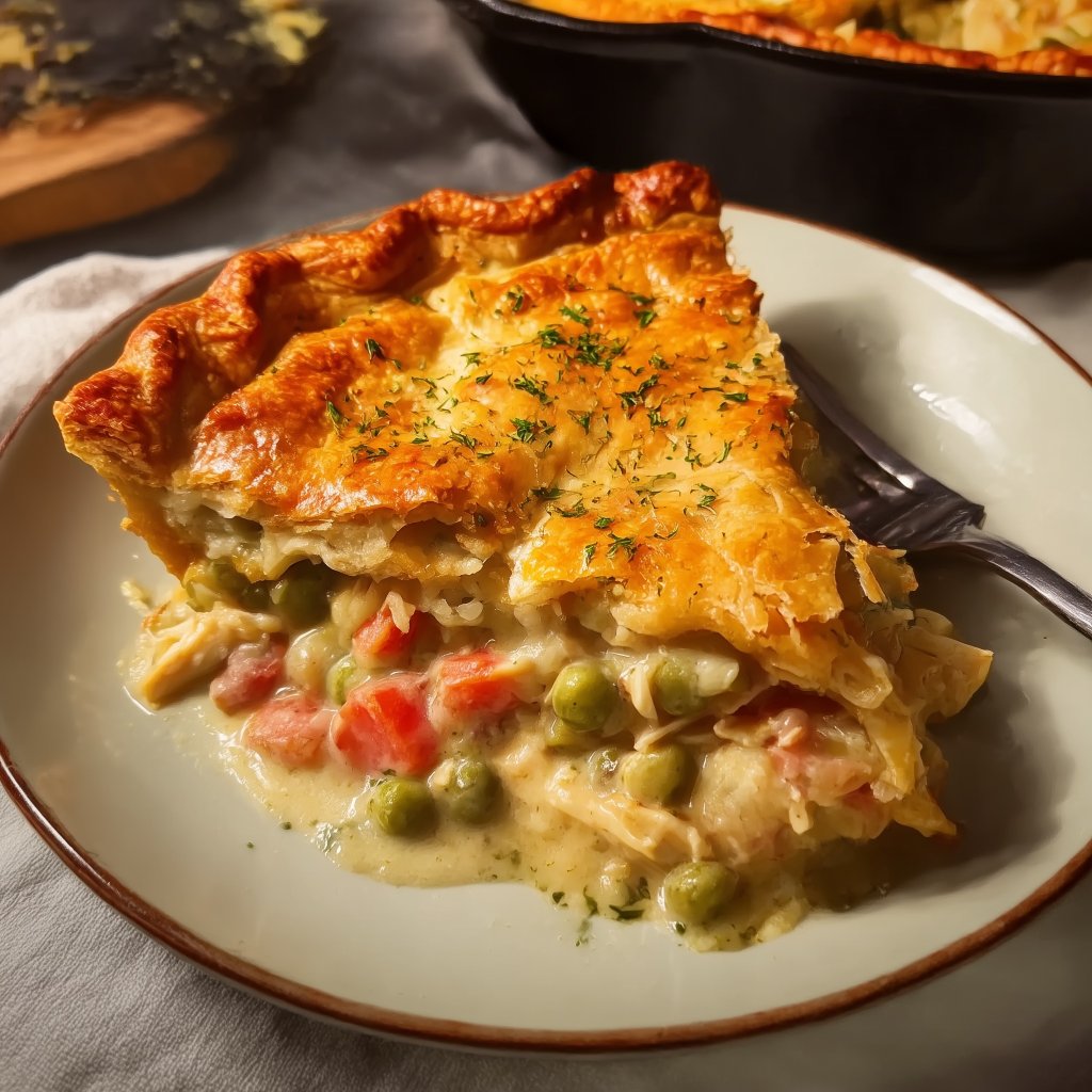 What I love most about a good pot pie is the contrast. The filling is creamy and savory, packed with tender chicken, soft potatoes, sweet carrots, and peas that pop a little when you bite into them. Then there’s the crust—golden, flaky, and buttery, shattering at the edges where it browns against the dish.
