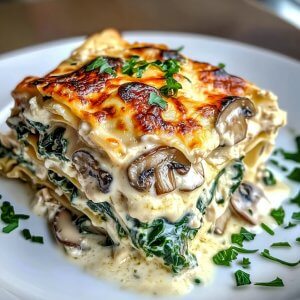 Here’s what you get in every slice: tender noodles, a silky white sauce, savory mushrooms browned until they taste almost meaty, and spinach tucked into the layers so it feels fresh instead of fussy. There’s ricotta for that classic lasagna creaminess, mozzarella for the stretchy pull, and Parmesan to sharpen everything up.