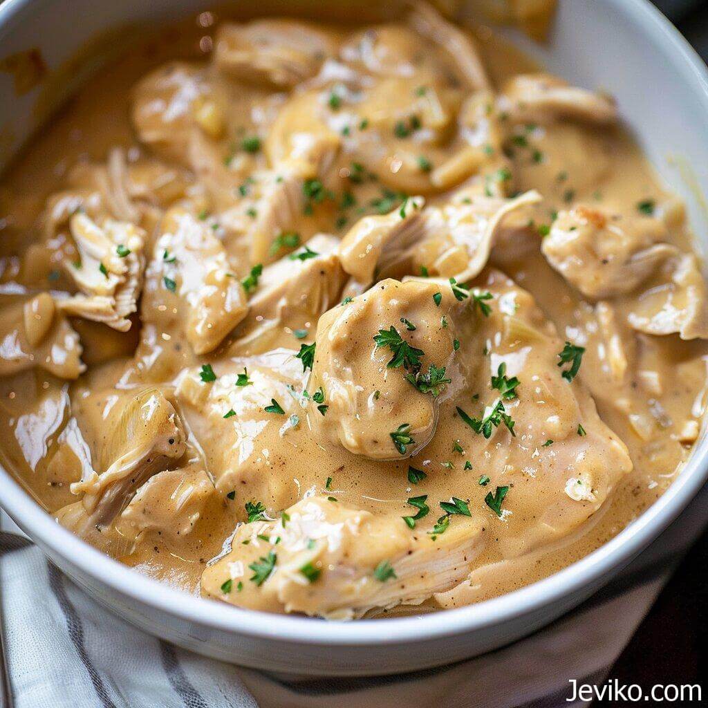 - Serve the creamy chicken and gravy over mashed potatoes, rice or biscuits. Garnish with chopped parsley. Enjoy this comforting meal!
