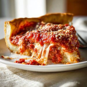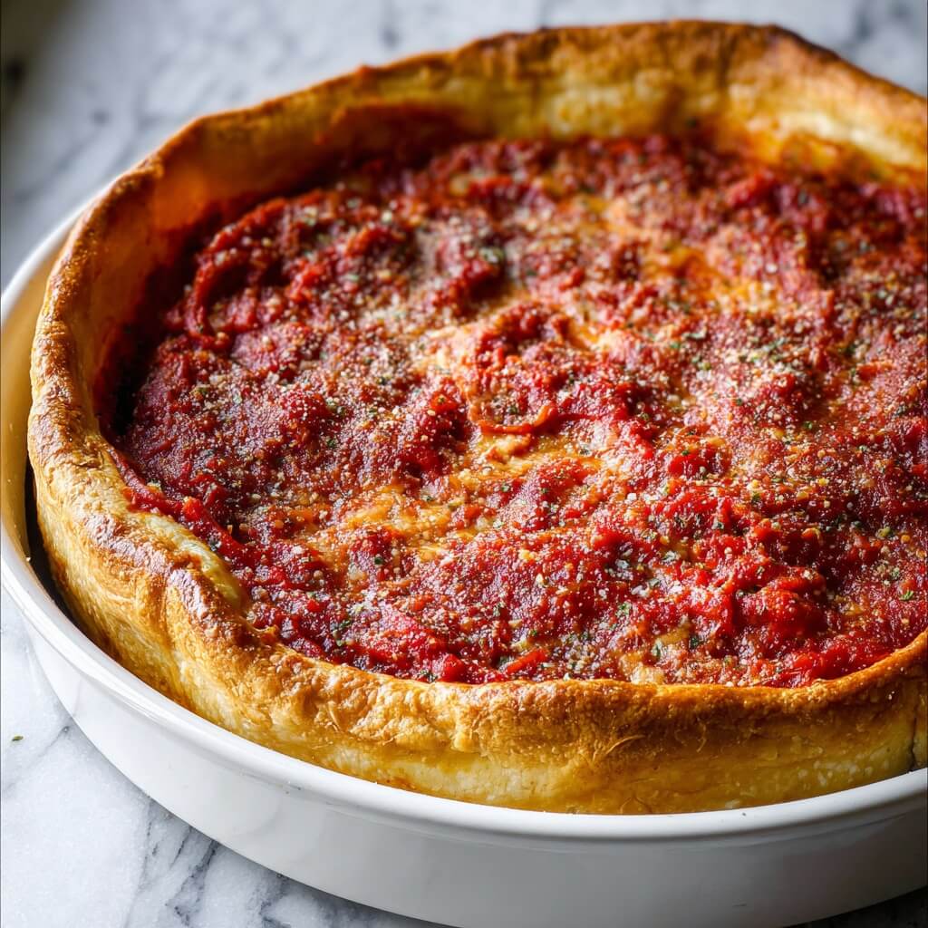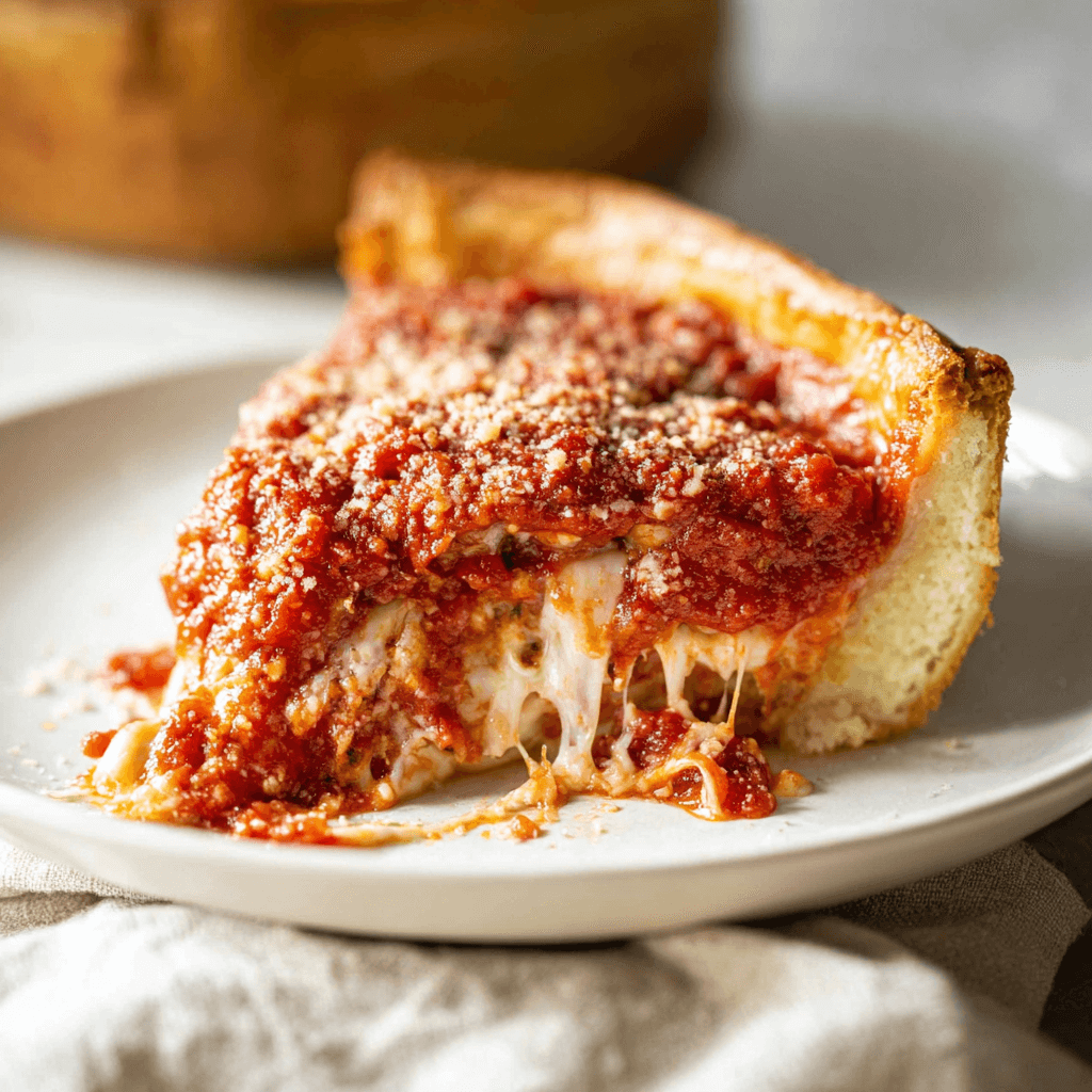 This is the kind of dinner you plan around. Not because it’s hard, but because it feels like an event when it comes out of the oven. The pan is heavy. The top is red and glossy. The edges sizzle a little. And when you cut into it, you get that signature layered look that makes deep dish so satisfying.