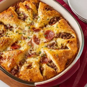 This Italian Crescent Casserole is the kind of dinner that makes a busy night feel handled. You get a buttery crescent-roll crust, a hearty sausage-and-marinara filling, and a thick layer of melted mozzarella on top. It bakes up golden around the edges, bubbly in the middle, and smells like you’ve been cooking all afternoon.