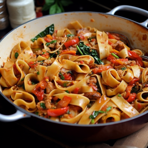 The name sounds wild, but the idea is simple. You cook pasta. You brown sausage. You sauté bell peppers and onions until they get sweet around the edges. Then you pull it together with a tomato-based sauce that’s rich, slightly tangy, and clings to every noodle. It’s the kind of sauce that coats, not floods.