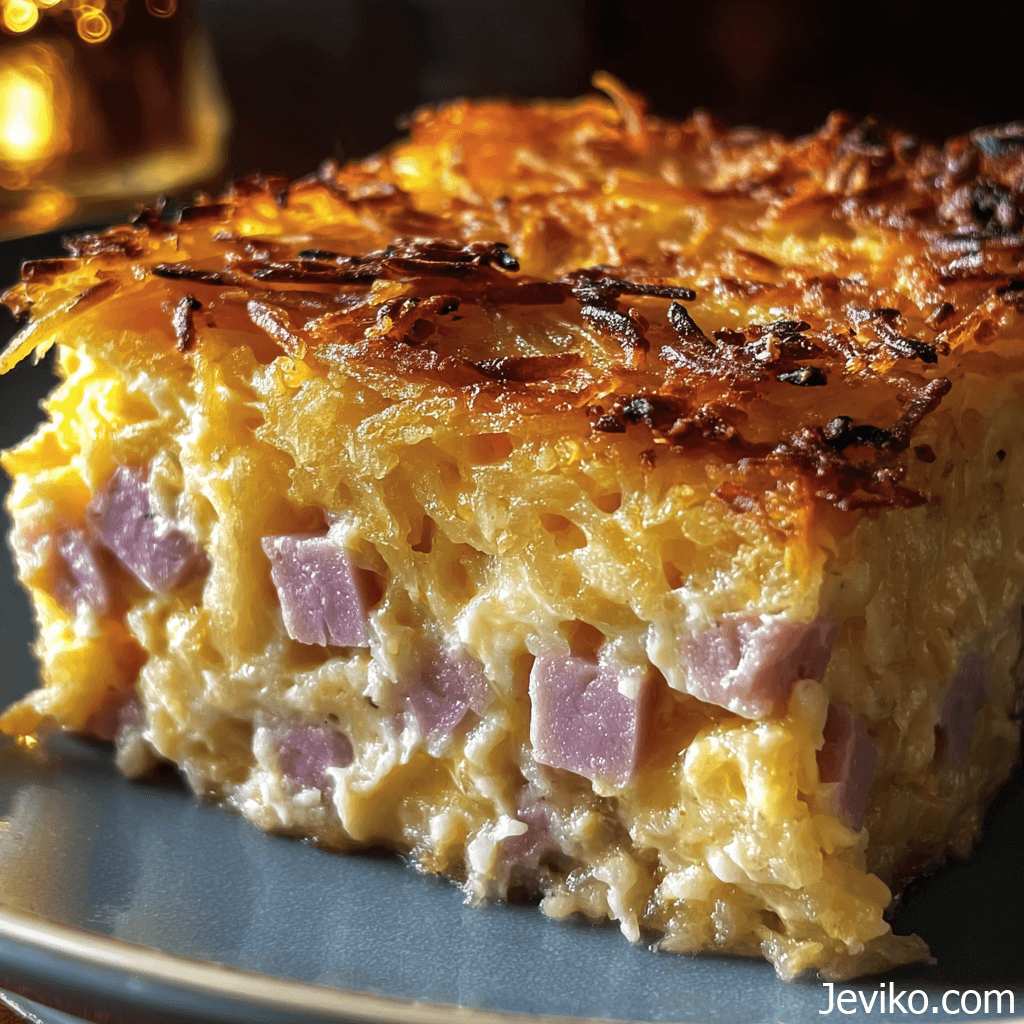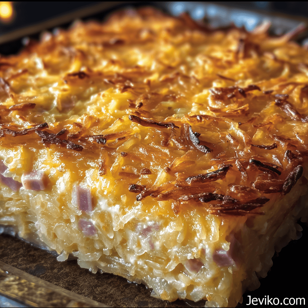 This recipe takes familiar ingredients and treats them with care. The hash browns are thawed and seasoned so they bake up tender rather than watery. The ham and cheese mixture is creamy with a subtle lift from Dijon mustard. The topping turns crisp and golden, offering a quiet crunch that balances the soft layers beneath. It’s the kind of dish you can build without measuring cups lined up like soldiers; still, I’ve included precise amounts so it works whether you’re cooking instinctively or following along step by step.