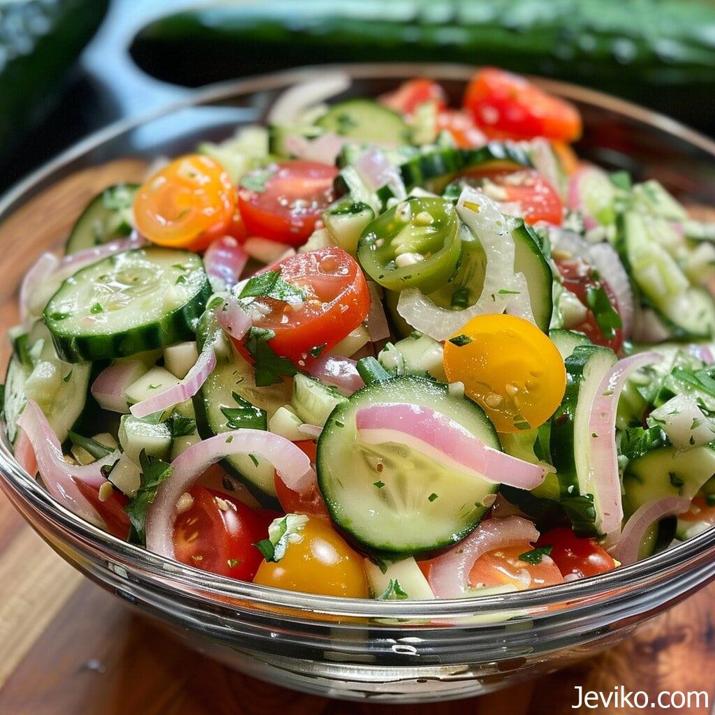 A fresh and easy marinated cucumber, onion and tomato salad bursting with summer flavors. This Mediterranean-inspired chopped veggie salad tossed in a tangy lemon oregano dressing is crisp, flavorful and endlessly adaptable. The perfect accompaniment to grilled meats or a light meatless main.