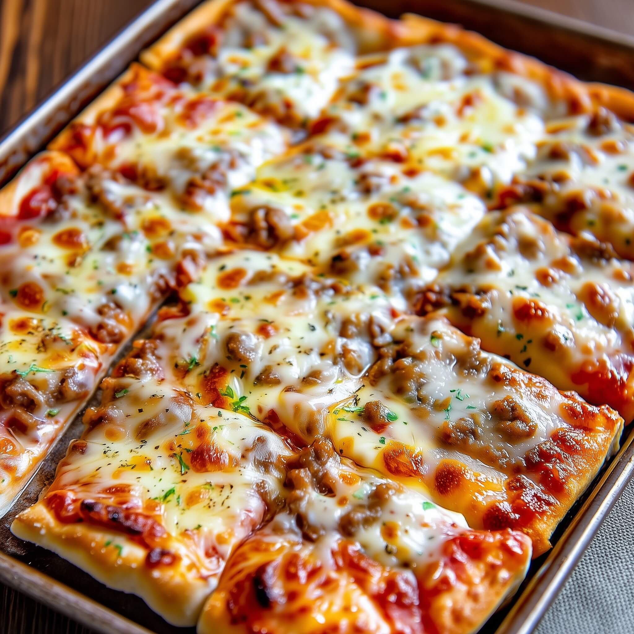 SOFT, PAN-BAKED CRUST: It’s not thin or crackly. It’s tender, thick, and made for big squares.