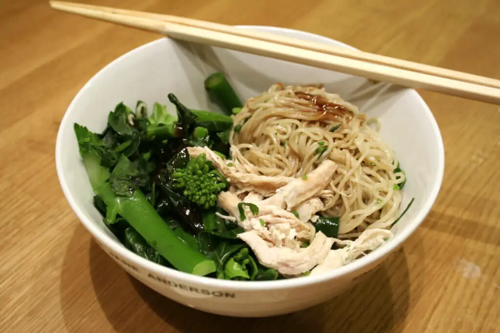 - Divide courgette/noodles/rice between bowls, scatter the chicken over, and pour over the sesame sauce.