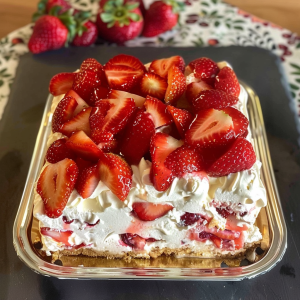 This is the kind of dessert that feels like a little relief. No oven. No complicated timing. No stress about whether a cake is baked through or a frosting will hold. You mix a creamy filling, slice strawberries, stack everything in a dish, and let the fridge do the work.