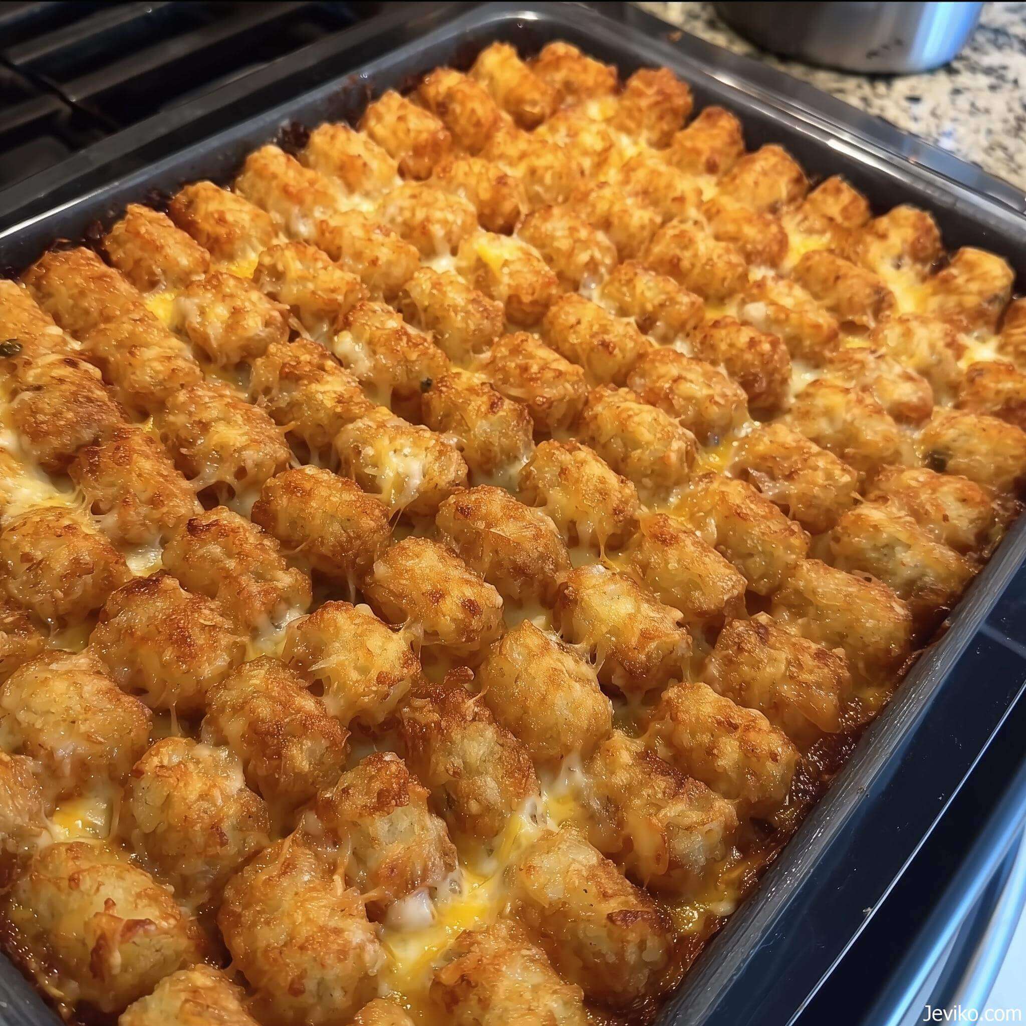 - Bake uncovered 30–35 minutes, until tots are golden and edges are bubbling.