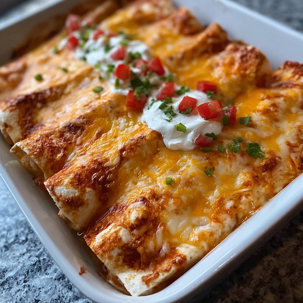 Warm tortillas wrapped around tender chicken and melty cheese, tucked into a pan, then covered in a creamy white enchilada sauce that turns bubbly and golden in the oven. The edges get a little toasty. The middle stays soft and rich. And when you cut into the pan with a spoon, the sauce pools in the corners like it was meant to be there.